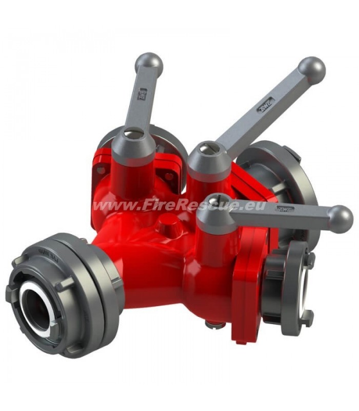 Wasserverteiler werden verwendet, um Wasser unter verschiedenen Benutzern oder Feuerwehrmannschaften zu verteilen. Dreiteilige Wasserverteiler ermöglichen die Aufteilung des Wassers in drei Gruppen.