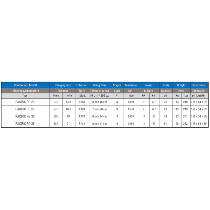 Die PACIFIC-Serie bietet mobile Lösungen in den Bauformen E und P, die ortsfest installiert oder in Fahrzeugen transportiert werden können. Die geräuscharmen Versionen C, CX, M und MX vervollständigen diese Familie professioneller Hochdruckkompressoren mit unterschiedlichen Leistungen bis zu 850 l/min.