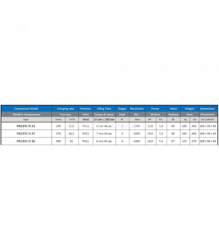 Die PACIFIC-Serie bietet mobile Lösungen in den Bauformen E und P, die ortsfest installiert oder in Fahrzeugen transportiert werden können. Die geräuscharmen Versionen C, CX, M und MX vervollständigen diese Familie professioneller Hochdruckkompressoren mit unterschiedlichen Leistungen bis zu 850 l/min.
