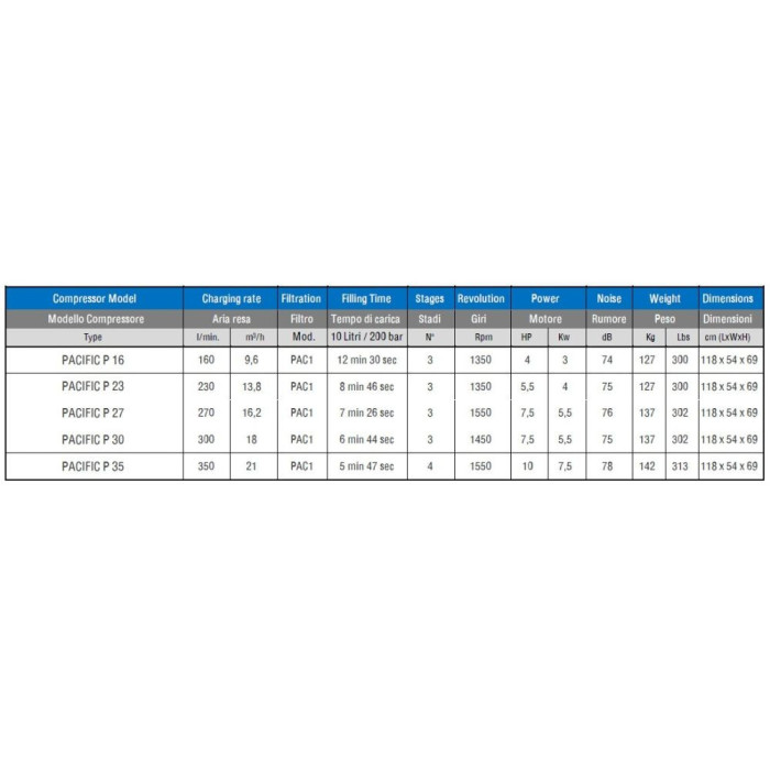 BREATHING AIR ist eine Produktlinie von NARDI COMPRESSORI, die Atemluft zum Befüllen von Flaschen für verschiedene Anwendungen (z. B. Tauchen, Sicherheit & Rettung, Militär usw.) bereitstellt. PACIFIC ist eine Gruppe von Kompressoren unterschiedlicher Leistung, die einen sehr hohen Wirkungsgrad aufweisen und mechanisch sehr robust sind, um viele Betriebsstunden zu gewährleisten. PACIFIC P sind Kompressoren der PACIFIC-Gruppe mit einer freien Luftförderleistung von 160 bis 350 Litern pro Minute.