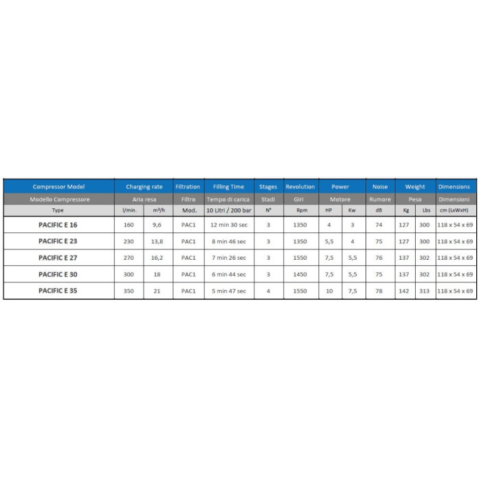 BREATHING AIR ist eine Produktlinie von NARDI COMPRESSORI, die Atemluft zum Befüllen von Flaschen für verschiedene Anwendungen (z. B. Tauchen, Sicherheit & Rettung, Militär usw.) bereitstellt. PACIFIC ist eine Gruppe von Kompressoren unterschiedlicher Leistung, die einen sehr hohen Wirkungsgrad aufweisen und mechanisch sehr robust sind, um viele Betriebsstunden zu gewährleisten. PACIFIC P sind Kompressoren der PACIFIC-Gruppe mit einer freien Luftförderleistung von 160 bis 350 Litern pro Minute.