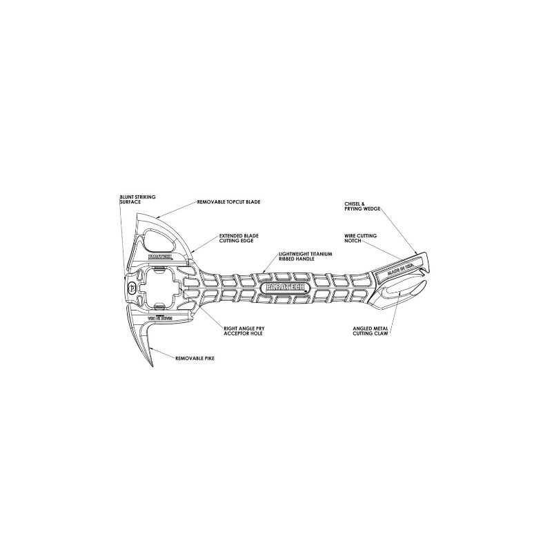 Die gesamte Crash Axe wiegt keine 1.200 Gramm, dank des Titan-Bodys und des speziellen, besonders griffigen Rippendesigns wurde dieser hervorragende Wert erreicht, ohne jedoch Einbußen bei der Stabilität und Haltbarkeit zu machen. Der Dorn und die Axtschneide aus Spezialstahl sind modular konzipiert und können schnell gewechselt werden. So kann die Crash Axe auch mit anderen Werkzeugeinsätzen (derzeit in Planung) individuell angepasst werden. Am anderen Ende der Axt wurde eine Blechschneidklaue mit Drahtschneider verbaut, die auch zum Hebeln geeignet ist.