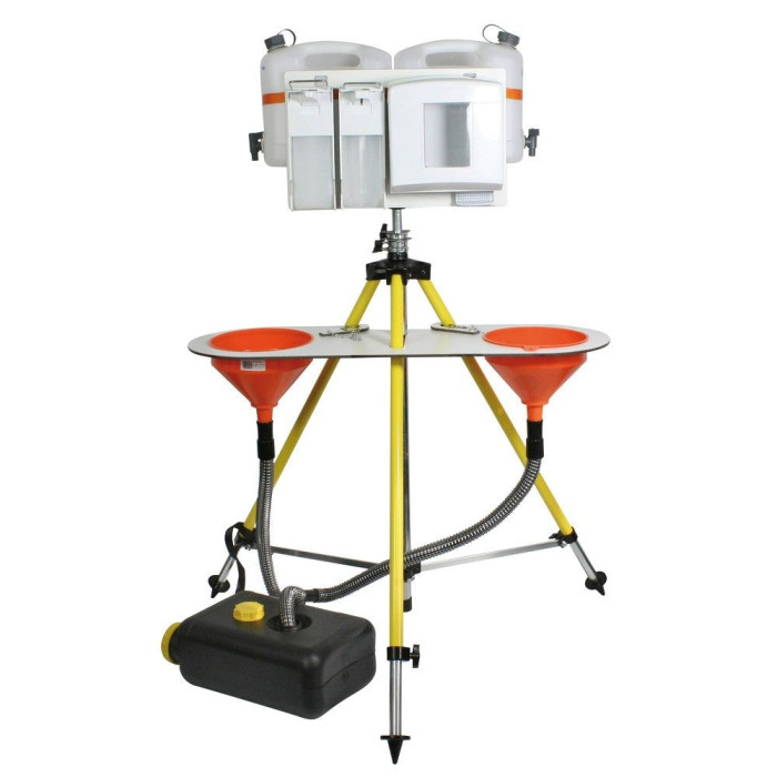 Ein kompletter Waschplatz für Behandlungsplatz oder Sanitätszelt. Alles wichtige zur Handhygiene an einem Platz. Zwei Personen können hier gleichzeitig Hände reinigen und desinfizieren.
