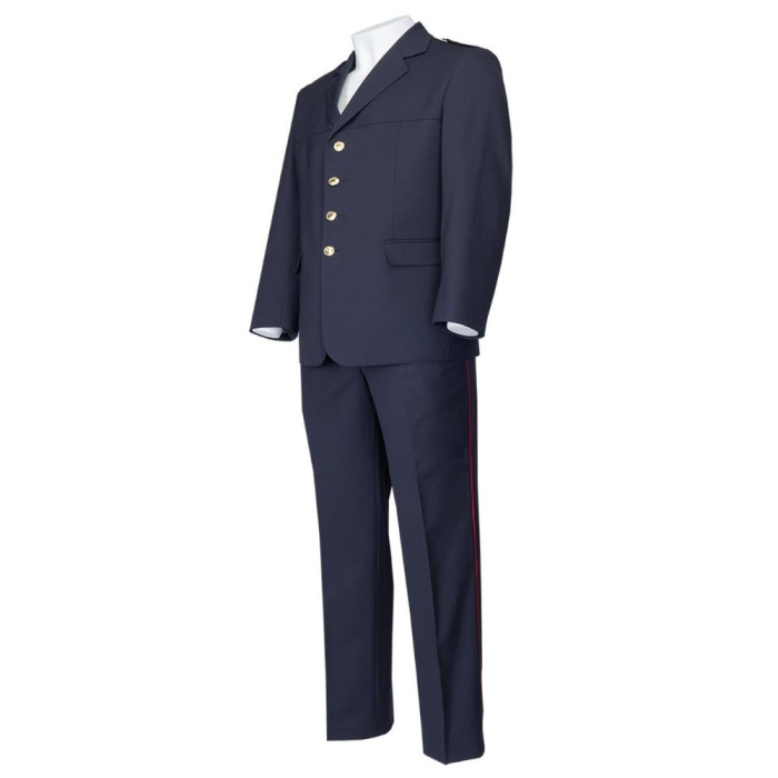 Die Hose besteht aus modernem und bequemem Kleid mit zwei Falten. Die englischen Taschen sind auf den vorderen Beinen gestickt, und eine Falte in der Mitte der Hose ist zerknittert. In der Seitennaht befindet sich ein rotes Eizellenband, 2 mm breit. Die Hose wird an den Klienten angepasst und natürlich, indem sie den Regeln für die Brandbekämpfung feierliche Kleidung folgt