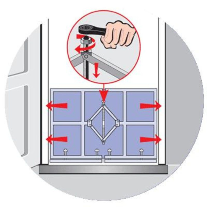 Ein an der Rückseite des Rahmens angebrachter Hebemechanismus ermöglicht es, Rahmen und Abdeckung teleskopartig in die Breite in den Wandbereich (die Laibung) direkt vor der Tür auszufahren. Vier Bolzen an der Unterkante des Rahmens werden dann so eingestellt, dass sie eine Abdichtung zum Boden gewährleisten.