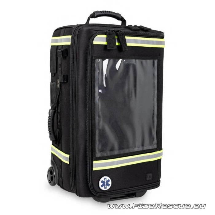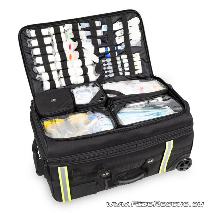 Große Notfalltasche mit integrierter Sauerstoffversorgung und entlastendem Trolley-System für den komfortablen Transport. Das integrierte, verstaubare Rucksacktragesystem unterstützt bei Einsätzen im unwegsamen Gelände. Vier herausnehmbare Reißverschluss(RV)-Modultaschen mit Klarsichtfenster gewähren beste Übersicht.