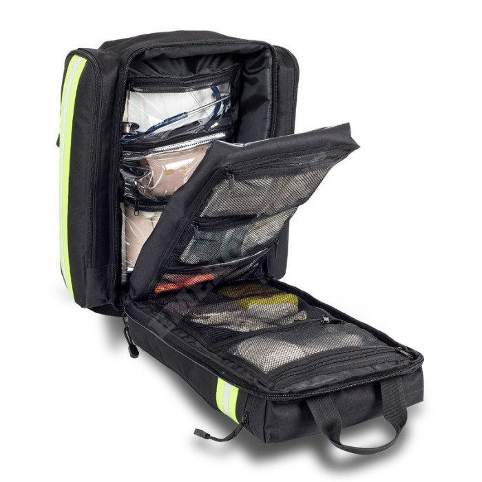 Mittlere Kapazität Basic Life Support (BLS) Rucksack. Sein Hauptkörper hat einen peripheren Reißverschluss, der seine vollständige Öffnung erleichtert und Zugang zu einer zentralen Lasche und zwei seitlichen Körpern, die aus insgesamt 11 Taschen, 5 Maschen und 6 aus transparentem Material bestehen, geschaffen, um die Lokalisierung des gesamten Materials zu erleichtern innen untergebracht.