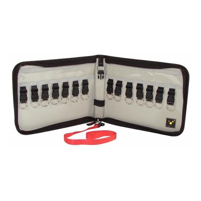 Schlüsselmappe für 14 Schlüssel im handlichen Querformat. Die Schlüsselclips sind übersichtlich nebeneinander angeordnet und mit einem großzügigen Beschriftungsfeld ausgestattet. Nach der Entnahme kann der Schlüsselclip am mitgelieferten Lanyard befestigt werden.