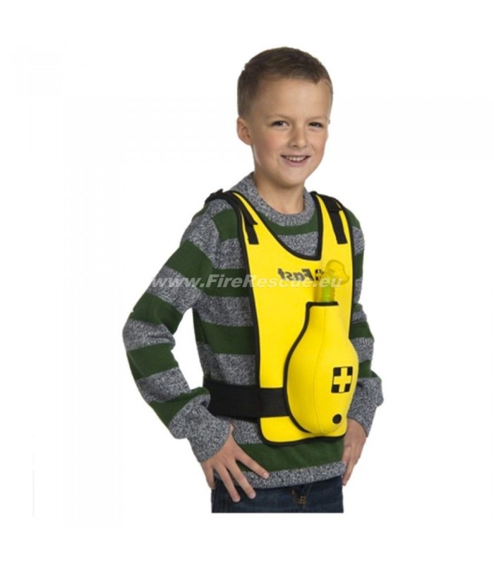 Der Kindertrainer verfügt über eine patentierte Luftblase beim Üben des Bauchschubmanövers (Heimlich). Es enthält außerdem ein aufsteckbares Schaumstoff-Rückenpolster zum Üben der Erstickungsrettungsprotokolle des Roten Kreuzes und des Europäischen Rates für Wiederbelebung.