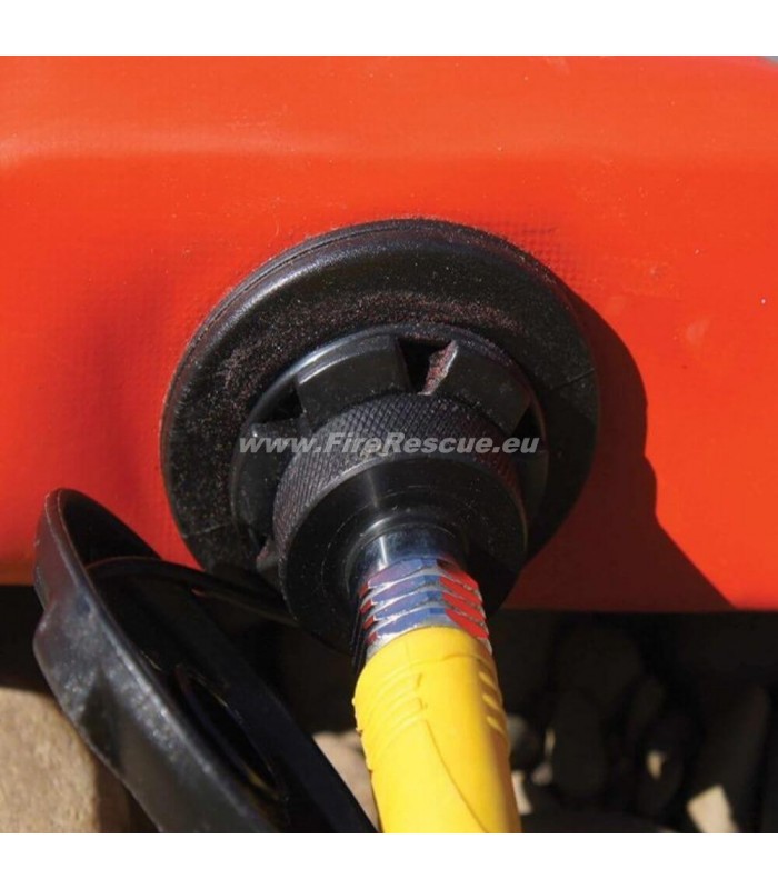 Das System verfügt über eine EN:250-zertifizierte 36-Zoll-Schlauchleitung mit Schraubventilanschluss und einem Schlauchdrehgelenk zur einfachen Bedienung. Durch den Schraubventilanschluss kann das Aufpumpen sicher von einer einzigen Person durchgeführt werden.