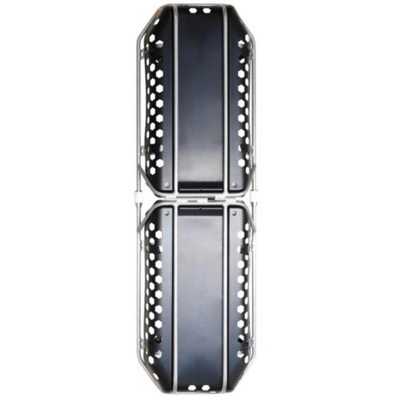 Rettungskorbtrage mit einer Schale mit sechseckigen Löchern, die das Entweichen von Wasser und Sand ermöglichen.