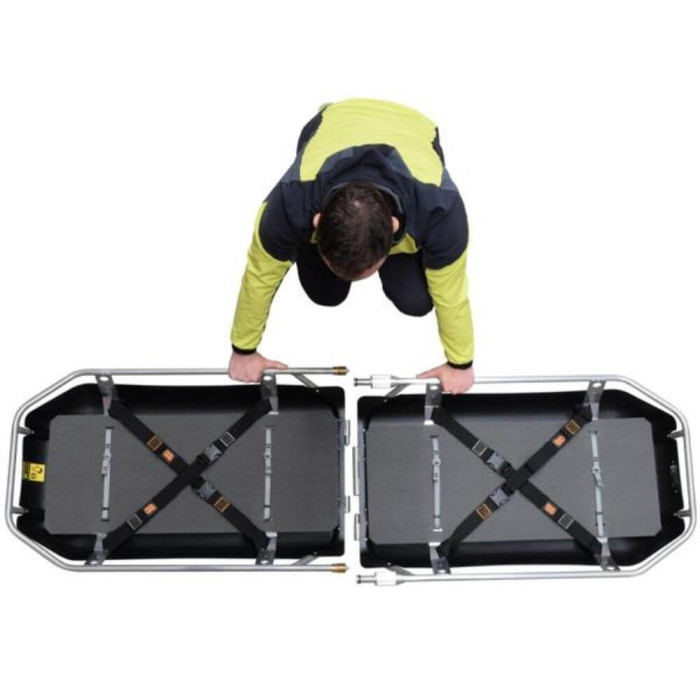 Extrem leichte Schalentrage, die zum einfachen Transport in zwei Teile zerlegt werden kann, ausgestattet mit Innenpolsterung und Befestigungsgurten.
