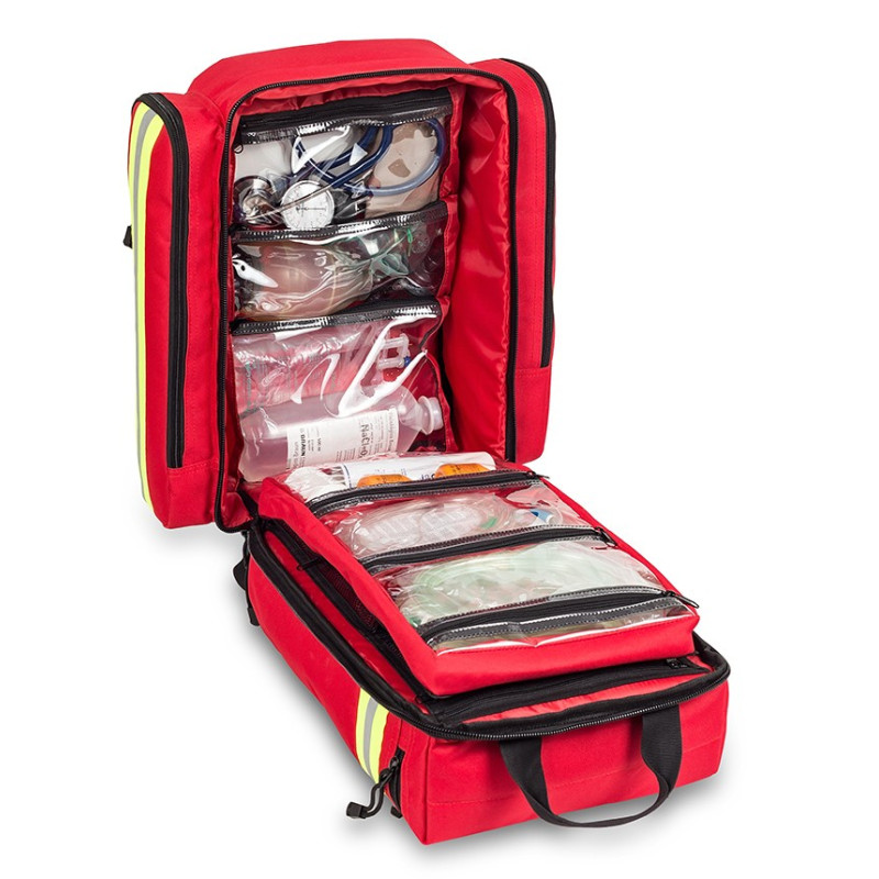 Erste-Hilfe-Kasten für Feuerwehrautos. Alle Geräte sind in einem hochwertigen und transparenten Elite Bags Rescue-Rucksack in roter Farbe installiert und können auch in dunkelblauer oder schwarzer Farbe geliefert werden.