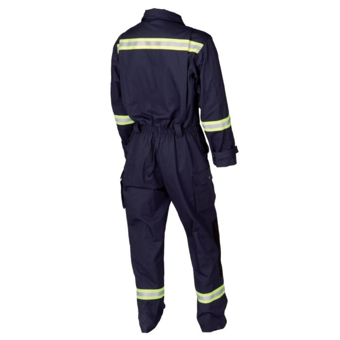 Die Coveralls sind atmungsaktiv, bequem und aus hochwertigem Material. Patches auf der Rückseite ermöglichen mehr Flexibilität und Bewegungsfreiheit. Die langen Ärmel haben am Ende einen Klettverschluss, um den Griff des Ärmels zu regulieren. Auf Brusthöhe haben wir auf der linken Seite eine Tasche für einen Radiosender und darüber eine Schlaufe für ein Mikrofon, auf der rechten Seite haben wir eine Tasche für eine Taschenlampe. Ein Patch auf der Innenseite des Rückens ermöglicht die Regulierung der Taillenweite, außerdem sind Gürtelschlaufen angebracht. Die Hose ist im Kniebereich verstärkt und hat auf jeder Seite des Oberschenkels eine praktische Tasche. Reflektierende Streifen an fünf Positionen sorgen dafür, dass der Feuerwehrmann unter allen Bedingungen sichtbar ist.