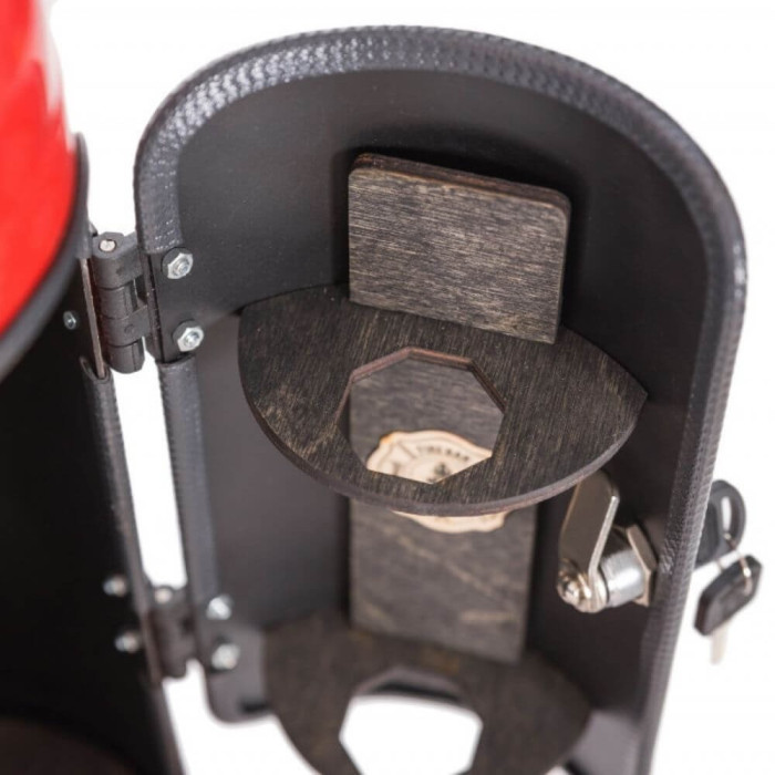 FIREBAR ist in klassischer roter Farbe. Im Inneren ist er mit dunklem Buchenholz im Farbton Eben ausgekleidet.