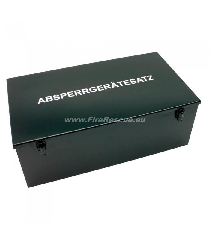 Der Satz wurde in Zusammenarbeit mit der Bundespolizei entwickelt. Durch das verstellbare Haltersystem konnte die Länge der Spieße (im zusammengeschobenen Zustand) auf 55 cm verringert werden. Durch den Standfuß ist der Halter auch für Asphalt und Beton geeignet. Alle Teile beflnden sich in einem stabilen Stahlblechkasten mit Tragegriffen. Er ist abschließbar, schwarz lackiert und trägt die Aufschrift ~Absperrgerätesatz~. Eine Inneneinteilung dient zur sicheren Aufnahme aller Teile. Die Aufstellfüße sind verzinkt und wetterfest und verfügen über eine Feststellschraube zur sicheren Aufnahme der Halter. Die Ecken sind leicht abgekantet, um sicheren Stand auch auf Kies und Erde zu gewährleisten. Die verstellbaren Halter aus verzinktem Stahl lassen sich bis zu einer Länge von 105 cm ausziehen. Zudem enthält der Satz eine Einschlaghilfe, zum sicheren Einschlagen bzw. Eindrücken der Halter in festere Böden, ohne dass der Spieß beschädigt wird sowie einen Abrollkarton mit Absperrband, 500 m, rot/weiß geblockt. Die Absperrbänder sind je nach Ausführung neutral oder mit unterschiedlichen Aufdrucken versehen.