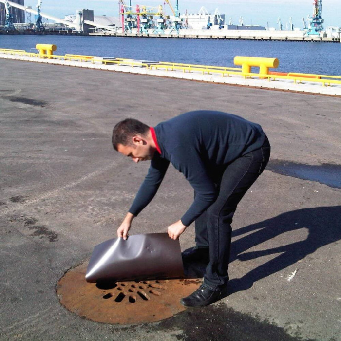 Die Abdeckung wird auf einen Stahl- oder Stahlgussdeckel der Kanalisation gelegt, von dem mechanische Verunreinigungen vorher entfernt wurden. Eine sehr hohe Abdichtung wird auf ebenen und glatten Oberflächen (Industriehallen, Straßen u. dgl.) erreicht. Der Anpressdruck wird auch durch den Druck der zurückgehaltenen Flüssigkeit selbst erhöht.