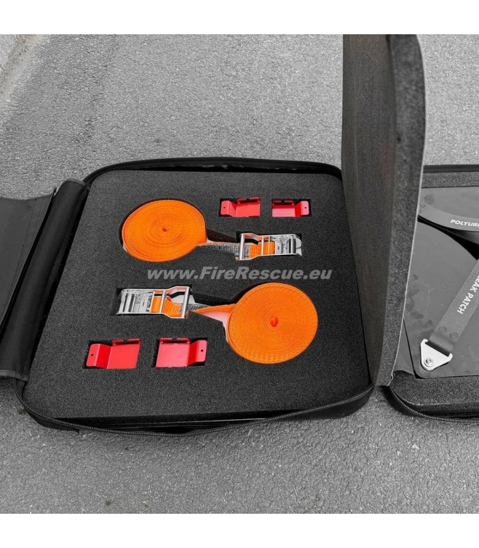 - Das Leckdichtkissen kann bei Bedarf repositioniert werden. Ausgestattet mit zwei verstellbaren Ratschen-Gurtsystemen gewährleistet das Set, dass das Leckdichtkissen fest an der beschädigten Oberfläche sitzt.