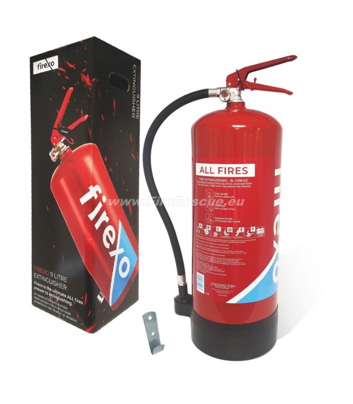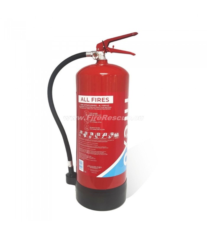 Firexo ALL FIRES 9-Liter-Feuerlöscher in Rot für ALLE Brandklassen: A, B, C, D, Elektro-, F- und Lithium-Ionen-Batteriebrände. Alle Brandschutzausrüstungen, die Sie brauchen, in einem Feuerlöscher. Perfekt für Ihr großes Fahrzeug, Restaurant, Hotel, landwirtschaftliche oder industrielle Räumlichkeiten.