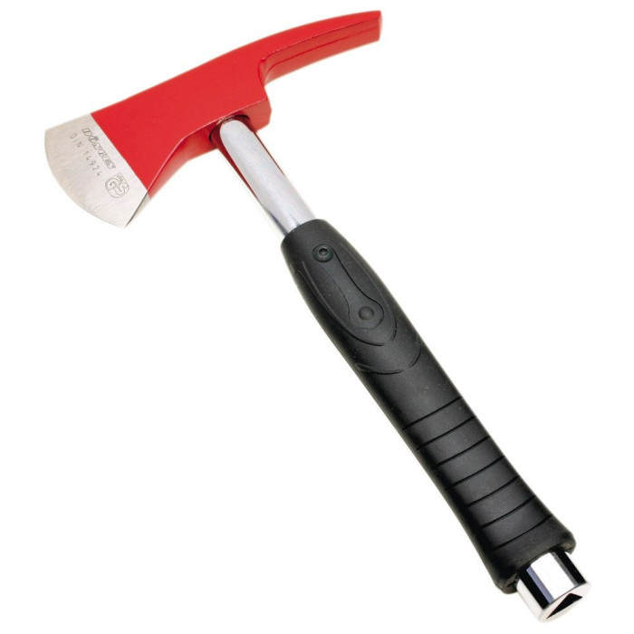 Rot lackierter Kopf mit geschliffener Spaltschneide und andererseits schmaler Hebelschneide, mit ovalem, in den Kopf eingepresstem Stahlrohrstiel. Rutschfester Kunststoff-Handgriff mit eingebautem Dreikantschlüssel für Absperrpfosten, Hydranten etc. GS-Zeichen.