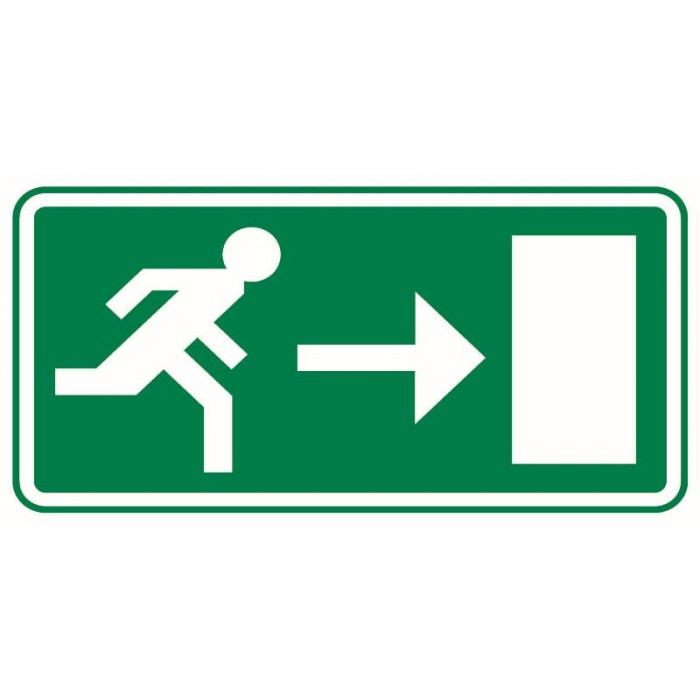 Warnetikette für die Evakuierung Ausfahrt Richtung RECHTS, das sich in öffentlichen Bereichen über dem Ausgang des Gebäudes befindet, um den Ausgang des Gebäudes anzuzeigen. Es ist nur für den internen Gebrauch bestimmt.