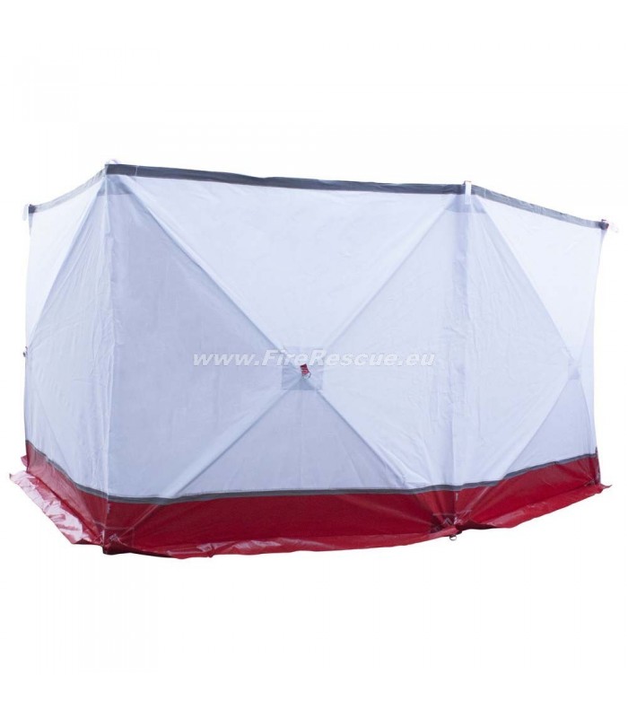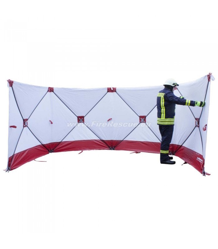 Die Wand besteht aus einem robusten, abwaschbaren Planenmaterial und Fiberglasstäben. Zahlreiche Laschen und Ösen ermöglichen ein einfaches Positionieren und Abspannen*. Am Anfang und am Ende der Wand sind Reißverschlüsse eingearbeitet, so lassen sich mehrere Wände miteinander Verbinden um auch große Einsatzstellen vor unerwünschten Blicken zu schützen.