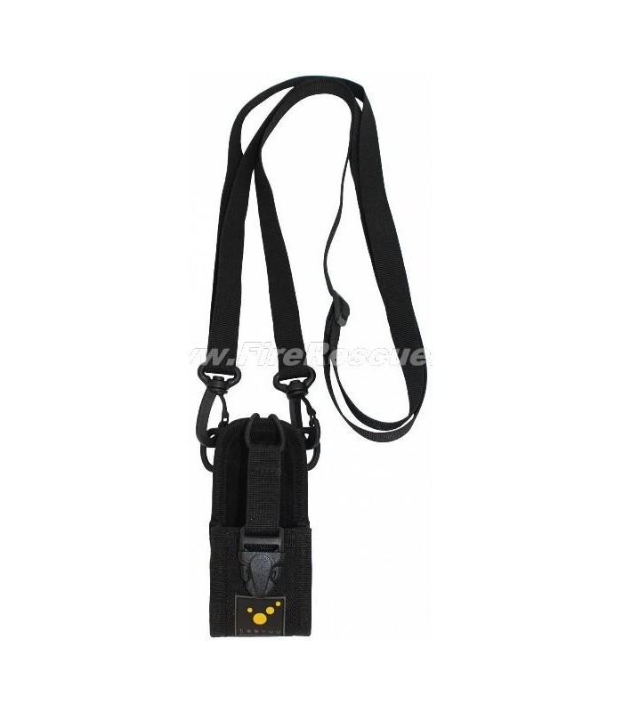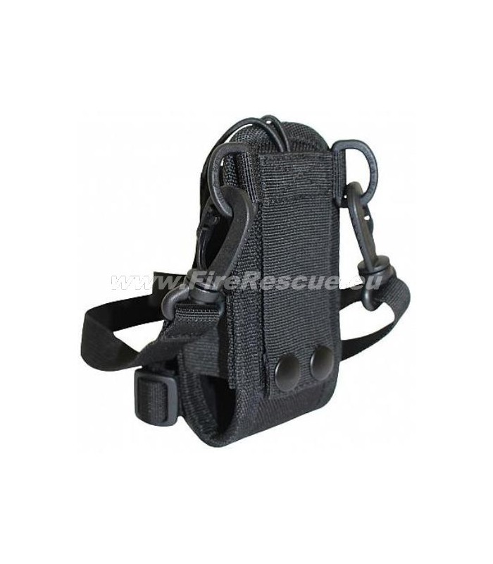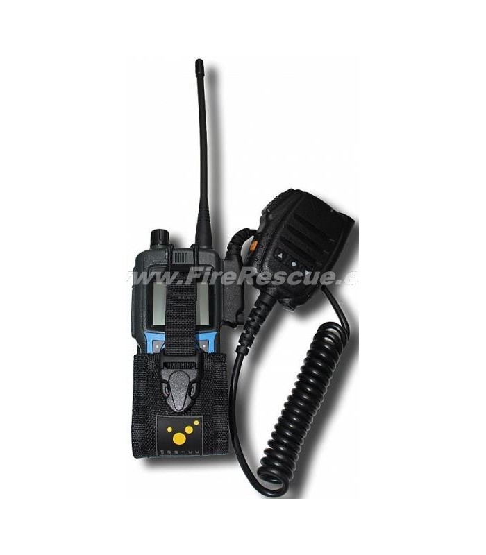 Holster für den schnellen Zugriff und die leichte Bedienbarkeit eines digitalen Handsprechfunkgerätes (HRT). Dafür sorgt das 4mm starke, gepolsterte Gerätefach das sich dank elastischen Bändern und Kordeln auf die individuelle Größe des Gerätes anpasst. Der Notruf-Taster bleibt dabei dennoch stets ungehindert erreichbar.