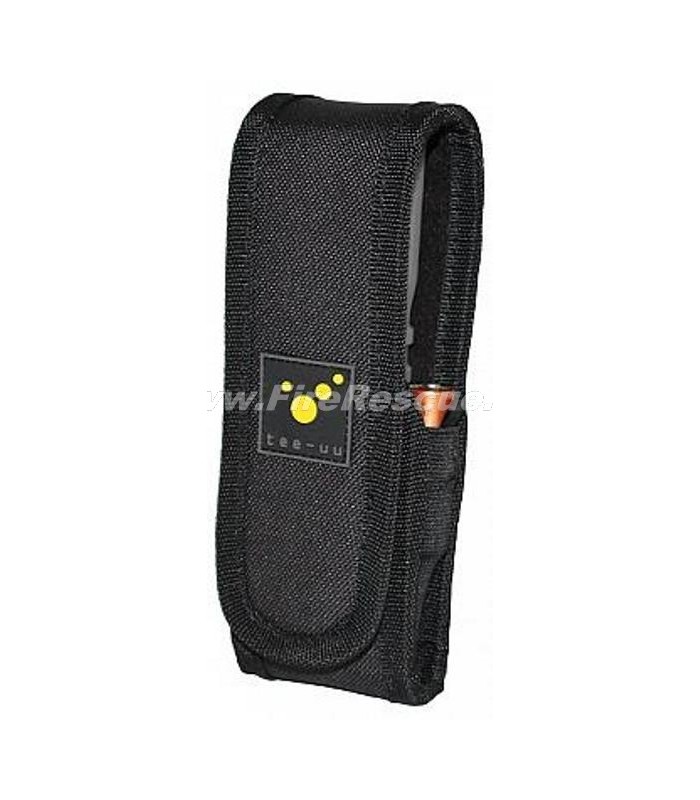 Sturdy holster for secure and protected storage of a slightly larger flashlight. This is ensured by the 4 mm thick, padded compartment with Velcro fastener. A plastic ring on the shelf prevents the automatic switching on of flashlights with push button switch located on the bottom of the lamp. Lateral, double elastic bands provide space for e.g. Spare batteries or pins.