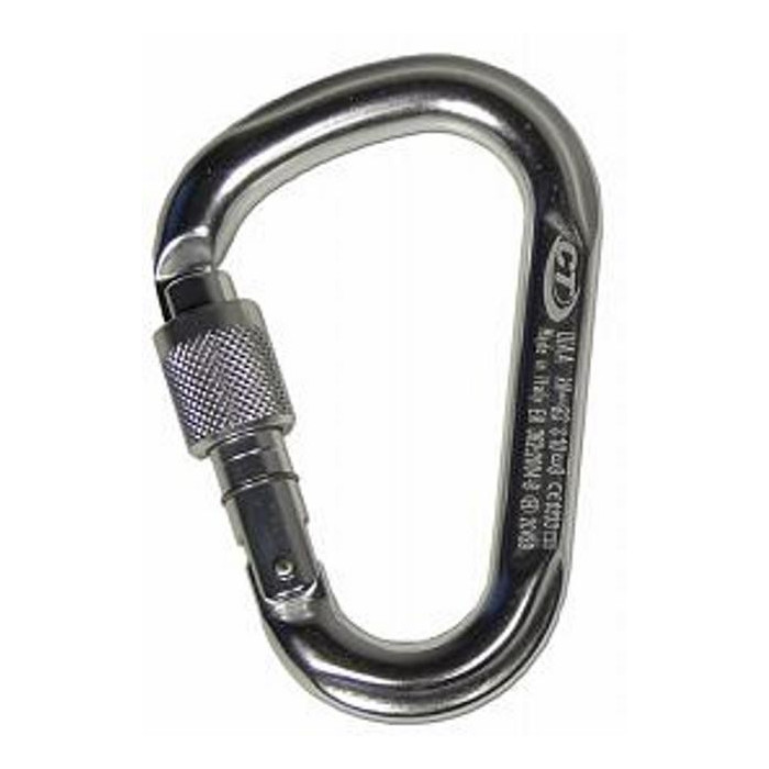 This classic pear-shaped aluminium screw carabiner is suitable and licensed for the attachment to a safety chain when applying the half clove hitch belay (HMS) or similar techniques.