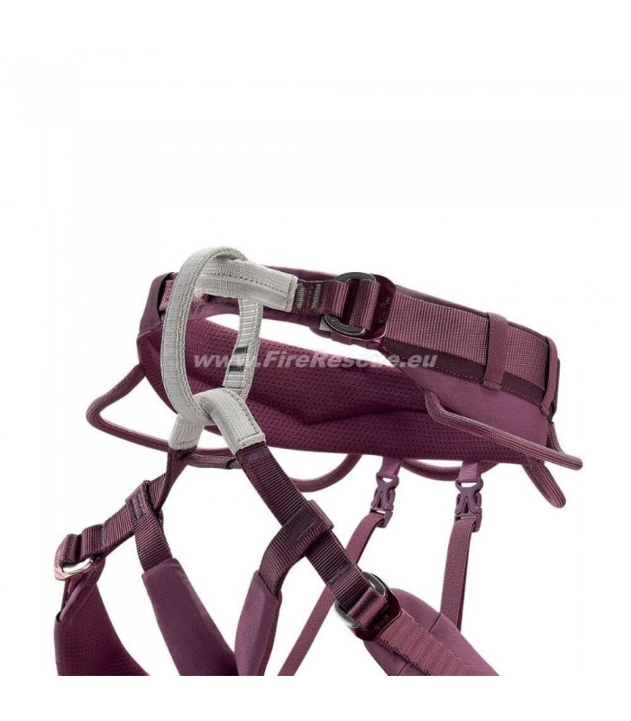 Women's climbing and mountaineering harness with adjustable leg loops for single and multi-pitch climbing.
