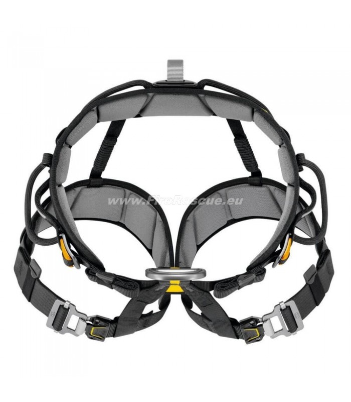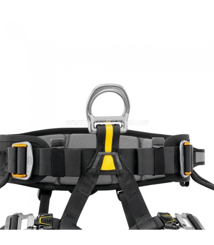 Metal ventral attachment point distributes the load between the waistbelt and the leg loops during suspension.