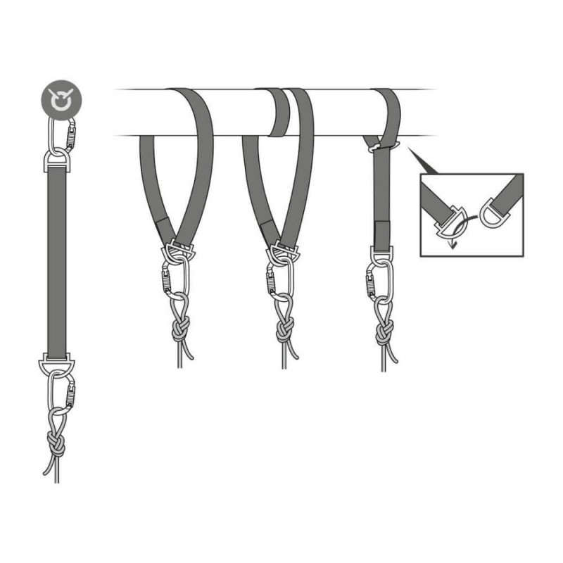 CONNEXION FIXE is a durable anchor strap with two forged steel attachment points. It offers several configurations for setting up an anchorage directly on an anchor or around a suitable structure. It is available in three lengths (100, 150 and 200 cm).