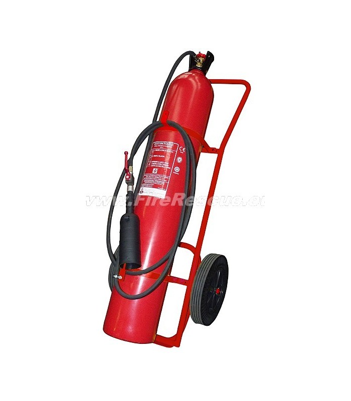 The contents of the extinguishing agent is 50 kg for extinguishing initial and bigger fires. The hose and nozzle are included. Contains Carbon dioxide (CO2) (for extinguishing combustible solids, flammable liquids and combustible gases).
