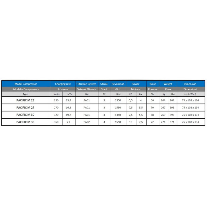 BREATHING AIR is a product line that includes several products made by NARDI COMPRESSORI which are designed to provide breathable air for the filling of cylinders for different applications (i.e.: scuba diving, safe & rescue, military, etc.). PACIFIC is a group of compressors of different capacities that have a very high efficiency and are mechanically very robust to ensure many hours of operation. PACIFIC M are compressors within the PACIFIC group that have free air delivery rates from 230 liters per minute to 350 liters per minute.