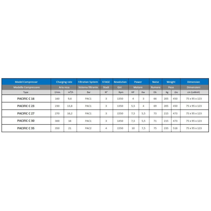 BREATHING AIR is a product line that includes several products made by NARDI COMPRESSORI which are designed to provide breathable air for the filling of cylinders for different applications (i.e.: scuba diving, safe & rescue, military, etc.). PACIFIC is a group of compressors of different capacities that have a very high efficiency and are mechanically very robust to ensure many hours of operation. PACIFIC C are compressors within the PACIFIC group that have free air delivery rates from 160 liters per minute to 350 liters per minute.