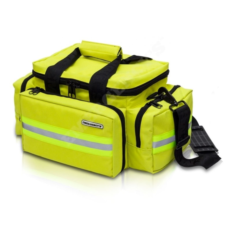 Practical and light emergency’s bag with two adjustable inner separators and a rack pocket in the flap to ease the organization of the sanitary material. It also have three external pockets, two of them are diaphanous and one is in the front and is internally subdivided and with elastic rubber-bands.