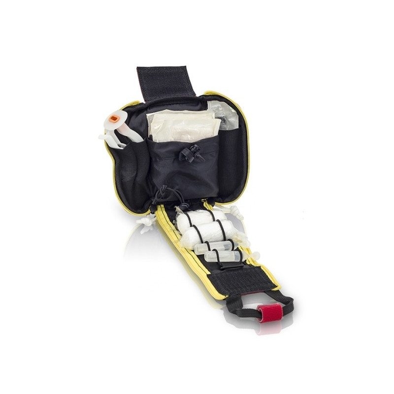 This individual first aid kit can be fastened to the belt to easily organize the first-aid material. The molle panel allows it to be attach to other bags or vests and its quick opening system allows to display it completely in just seconds.