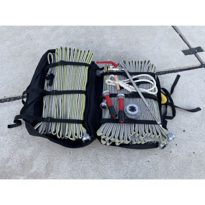 Gear backpack 4H is designed to hold four D25 hoses up to 30m, a divider and two stream nozzles. It has one extra large inner compartment with the top and the bottom. Both of these parts are equipped with straps to fix the hose. Between these parts is the plastic board with straps to fix the other two hoses. The plastic board is removeable. Thanks to that you can also use the whole inner compartment for other equipment (ropes, clothing, etc.)