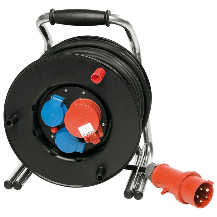 No slippage and confusion of the cable between reel and frame. Optimized winding space - capacity up to 40m H07RN-F 3G2,5. Extra deep construction, therefore especially safe stand. Easy winding with three handles, one of which has a twist handle.