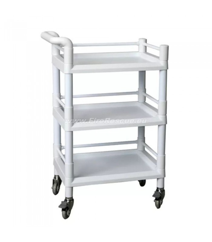 Multi-purpose patient trolley with three shelves.Features:- material: ABS plastic- four luxury wheels, two with brakes- size: 539 x 366 x 950 mm- weight: 8 kg