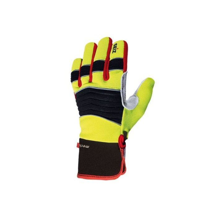 - Backhand: High visible yellow nylon fabric and black neoprene knuckle protectors.