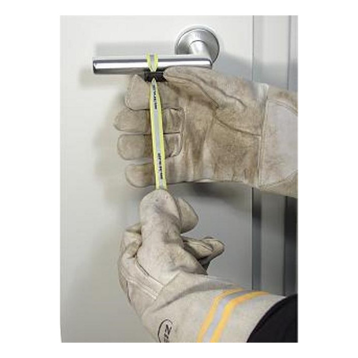 In order to mark already searched rooms and corridors. Thanks to the cord stopper, the 30 cm long CHECKER STRAP can be attached quickly and easily to any kind of door knob. The ribbon holds perfectly even under positive pressure ventilation. The 12 mm wide ribbon in safety yellow with an 8 mm wide traversing reflective stripe is clearly visible in smoky rooms as well.