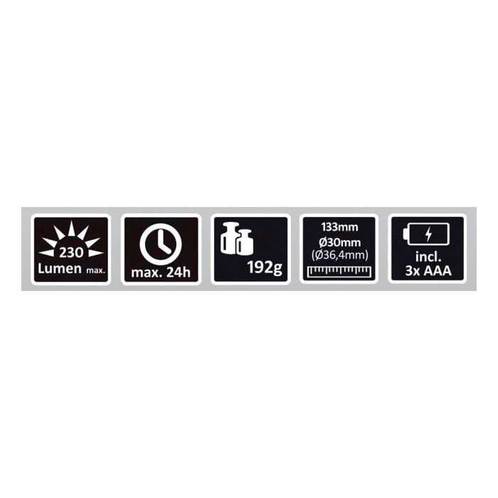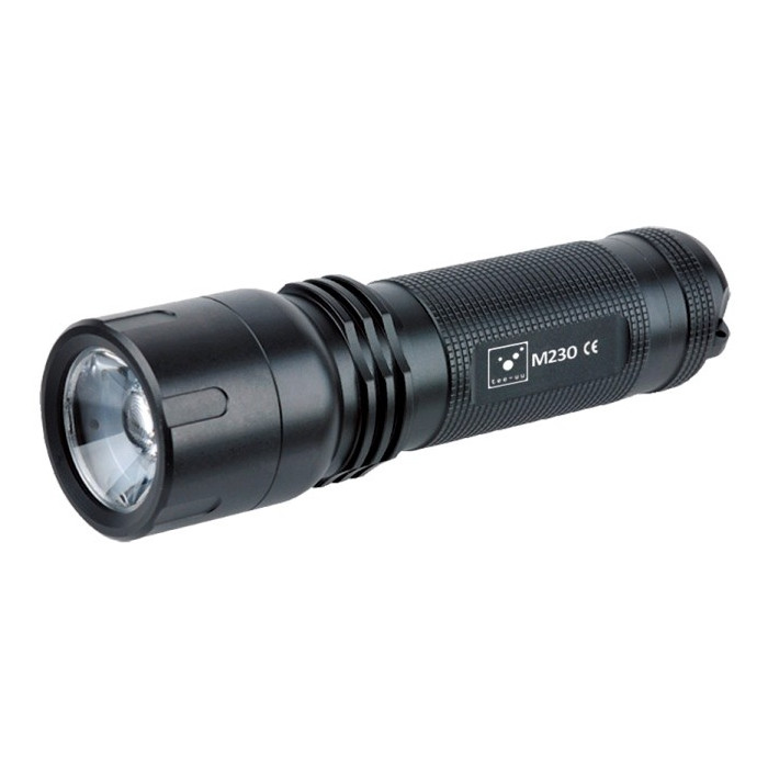 The handy M230 convinces with its robust and waterproof construction and an optimal ratio of light intensity to light duration. Constant light output is provided by a 5W high-power XPG LED from Cree, the world's leading manufacturer of LEDs from the USA.
