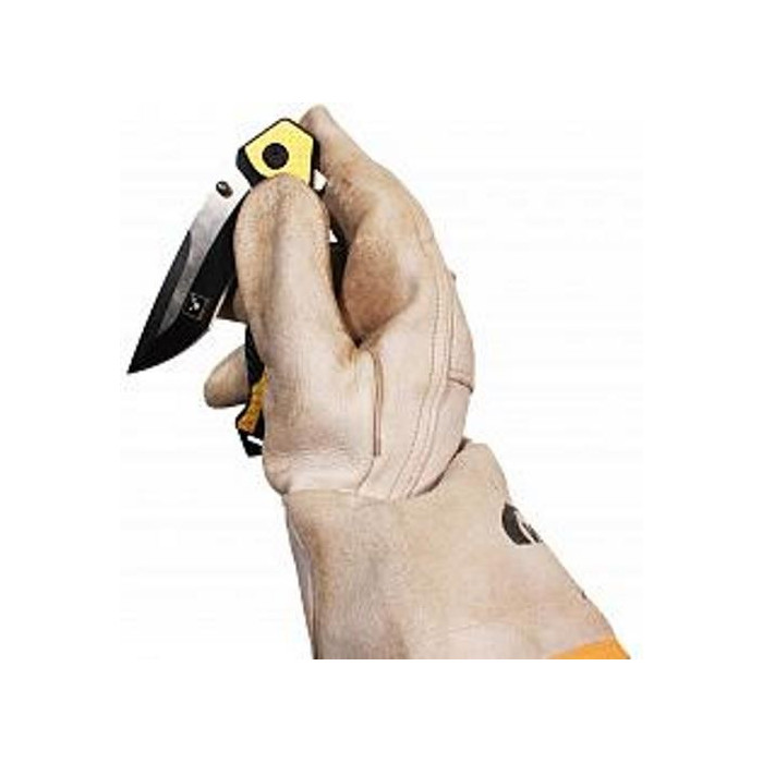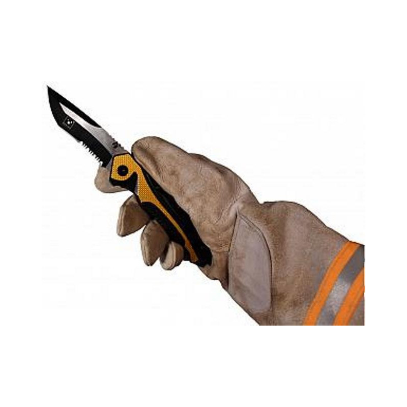 The rescue knife can be opened intuitively with one hand: By gently pressing with your thumb or forefinger, the blade automatically unfolds and locks.