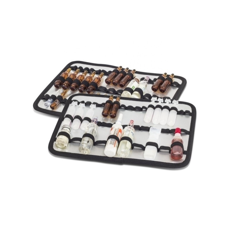 - 2 snemljivi plošči z različnimi velikostmi elastik (na obeh straneh), za prenos do 158 ampul. Ker sta ločljivi, se lahko ploščici postavi v hladilnik, ko nista v uporabi.