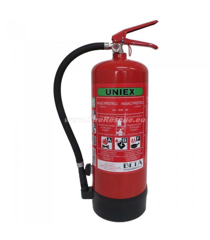 - Gasilni aparat na peno F6/F9 BETA UNIEX je napolnjen z vodo in gasilnim sredstvom BETA EFFEM. Ta gasilni aparat na peno, imenovan UNIEX, je edinstven v univerzalni uporabi pri gašenju. Gasilni aparat je pod stalnim pritiskom, po uporabi jo je mogoče ponovno napolniti. Tlak gasilnega aparata je viden na manometru, nameščenem na ventilu glave.