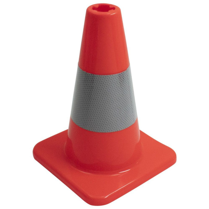 Ta poceni prometni stožec ni testiran BASt in je zato namenjen za uporabo v komercialnih in nejavnih prostorih. Fluorescentno rdeča je prekrita z odsevnimi srebrnimi obroči.