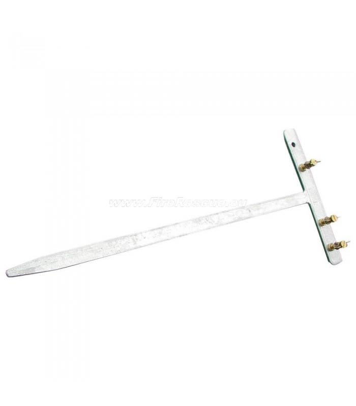 Ozemljitvena konica iz T-jekla, pocinkana, pribl. 550 mm dolga. Opremljena s štirimi vijaki za ozemljitev in krilno matico M8 za pritrditev ozemljitvenega kabla.