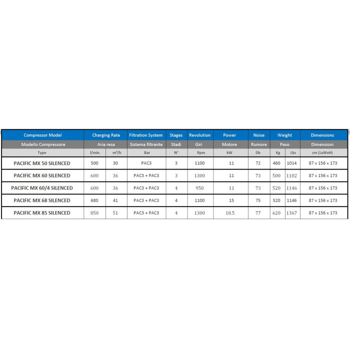 BREATHING AIR je linija izdelkov, ki vključuje več izdelkov podjetja NARDI COMPRESSORI, zasnovanih za zagotavljanje zraka za dihanje pri polnjenju tlačnih posod za različne namene (npr. potapljanje, gasilci, varno in reševalno delo, vojska itd.). PACIFIC je skupina kompresorjev različnih zmogljivosti, ki imajo zelo visok izkoristek in so mehansko zelo robustni, da zagotavljajo večurno delovanje. PACIFIC MX so kompresorji znotraj skupine PACIFIC, imajo pretoke zraka od 500 litrov na minuto do 850 litrov na minuto.