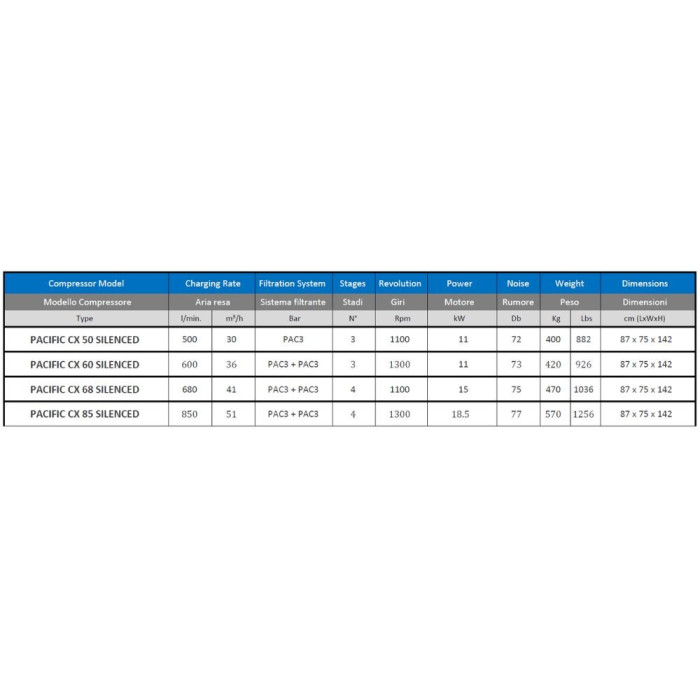 BREATHING AIR je linija izdelkov, ki vključuje več izdelkov podjetja NARDI COMPRESSORI, zasnovanih za zagotavljanje zraka za dihanje pri polnjenju tlačnih posod za različne namene (npr. potapljanje, gasilci, varno in reševalno delo, vojska itd.). PACIFIC je skupina kompresorjev različnih zmogljivosti, ki imajo zelo visok izkoristek in so mehansko zelo robustni, da zagotavljajo večurno delovanje. PACIFIC CX so kompresorji znotraj skupine PACIFIC, imajo pretoke zraka od 500 litrov na minuto do 850 litrov na minuto.